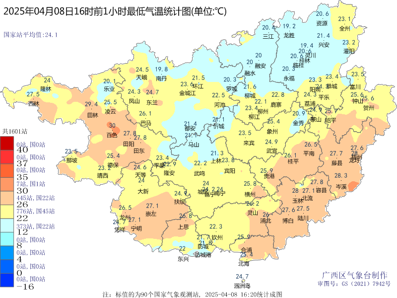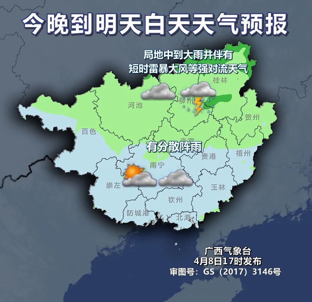 今天晚上到明天白天,桂林、柳州、河池、贺州等市阴天有阵雨或雷雨、局地中到大雨并伴有短时雷暴大风等强对流天气,其它地区多云到阴有分散阵雨。