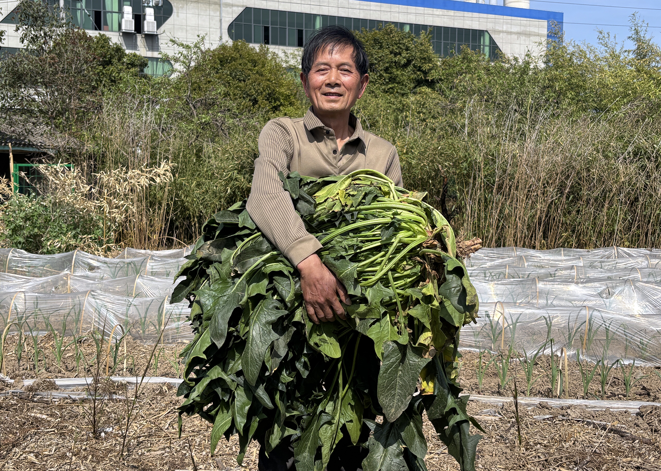 李安云和他种植的“菠菜王”。王林威陈章升摄