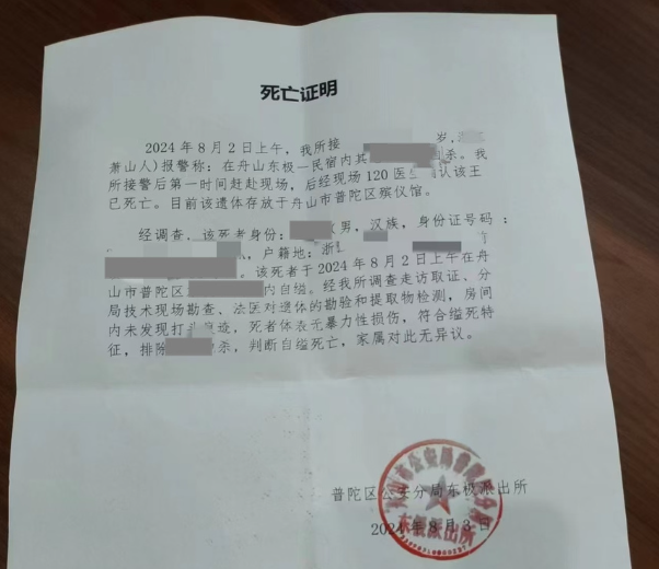 据媒体报道,7月31日,王越到女方所在医院反映问题,该院第一时间成立调解小组并开展工作。从医院理论出来,王越和女方去了舟山散心。8月2日凌晨2点18分,王越写下了遗书发给女方。上午8点51分,对方回复“等我”。徐先生称,直到当天上午11点,服务员进房间换浴巾,才在衣柜里面发现,王越用吹风机的电源线自缢身亡。