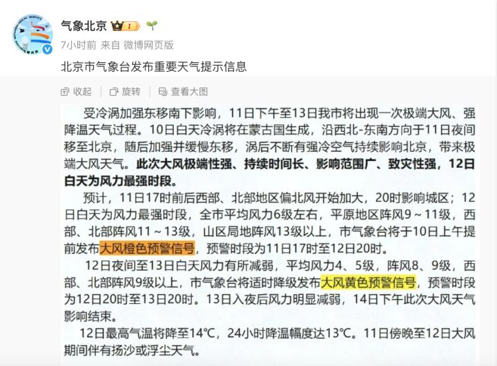 受冷涡加强东移南下影响,北京气象台昨天已连夜发布了重要天气提示,预计11日下午至13日将出现一次极端大风、强降温天气。