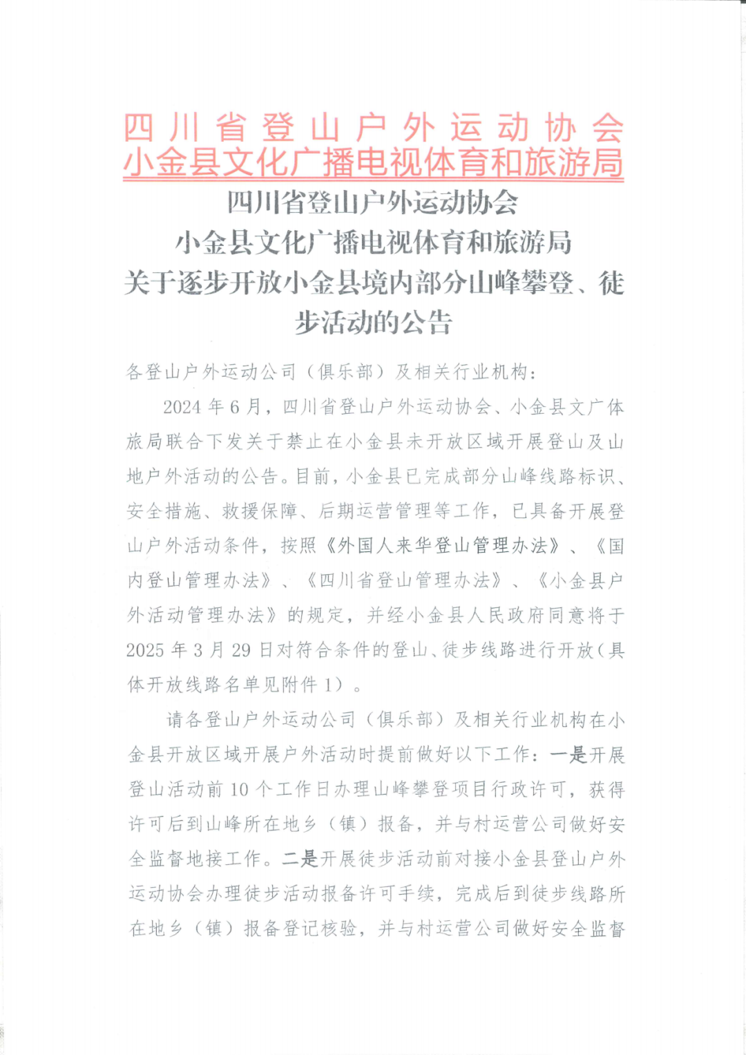在2025年3月19日,小金县文化体育和旅游局发布《关于逐步开放小金县境内部分山峰攀登、徒步活动的公告》,称目前小金县已完成部分山峰线路标识安全措施、救援保障、后期运营管理等工作,已具备开展登山户外活动条件,并在3月29日对符合条件的登山、徒步路线进行开放。