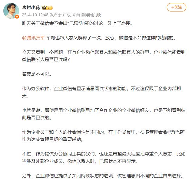 腾讯员工 @客村小蒋 4月10日在微博上发文进一步解释微信是否会推出“已读”回执,并谈到一个新的话题:在有企业微信联系人和微信联系人的群里,企业微信能否看到微信联系人是否已读。