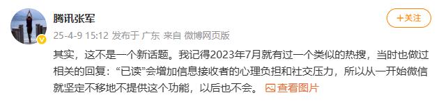 腾讯公司公关总监张军回应称,2023年7月就有过一个类似的热搜,当时也做过相关的回复:“已读”会增加信息接收者的心理负担和社交压力,所以从一开始微信就坚定不移地不提供这个功能,以后也不会。