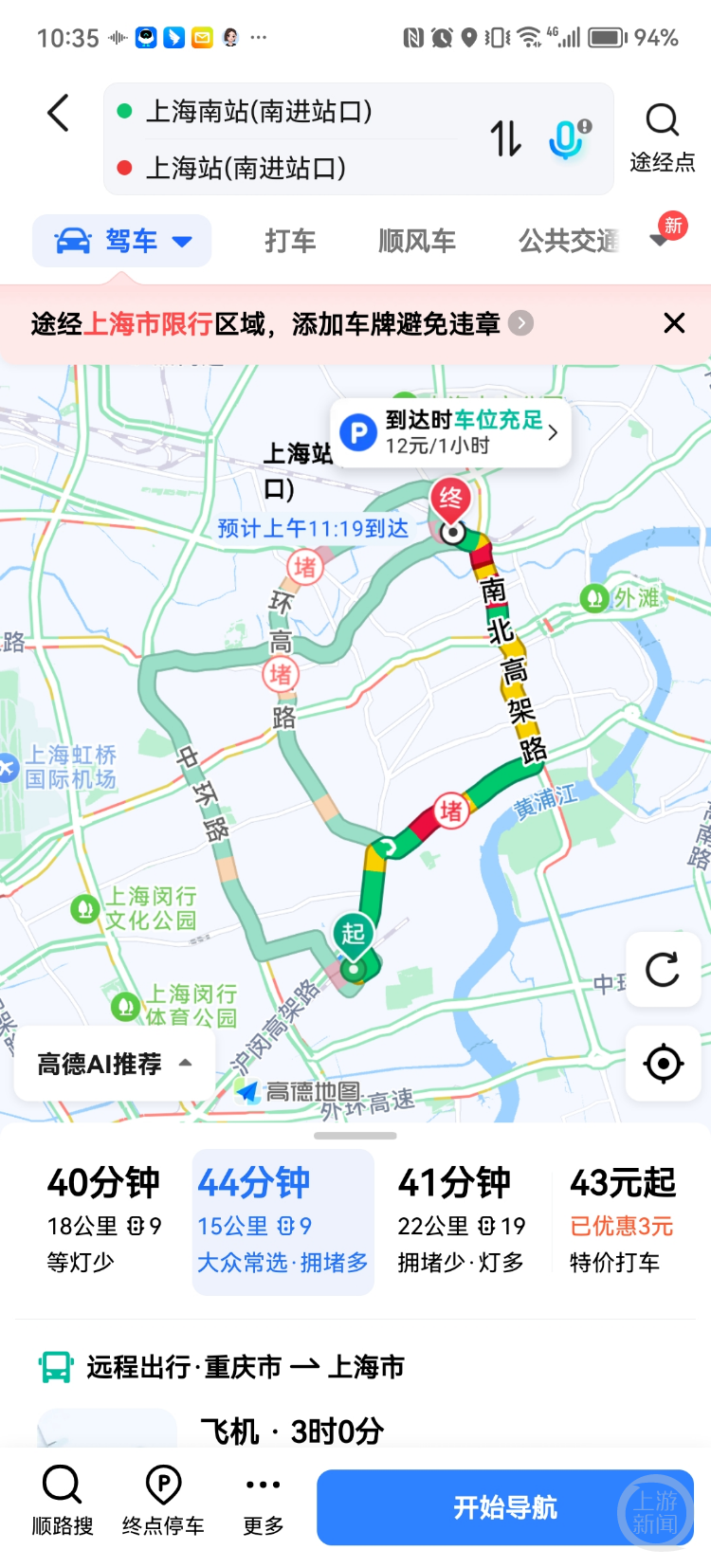 记者通过高德地图APP查询发现,上海南站至上海站,推荐的最短的开车路线距离为15公里。另外,两地之间还有地铁线,地铁1号线和3号线可以直达,用时分别为35分钟和37分钟。