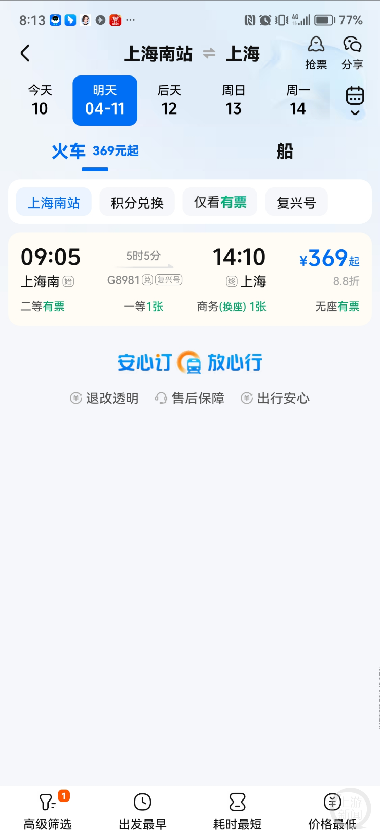 4月10日,记者在携程旅行APP上查询发现,4月11日,上海南站至上海站的确有一趟高铁G8981,11日09:05发车,14:10到达,用时为5小时5分钟,二等座票价为369元,经停站为苏州南、湖州南浔、湖州东、南京南、常州、苏州、昆山南、安亭北等。