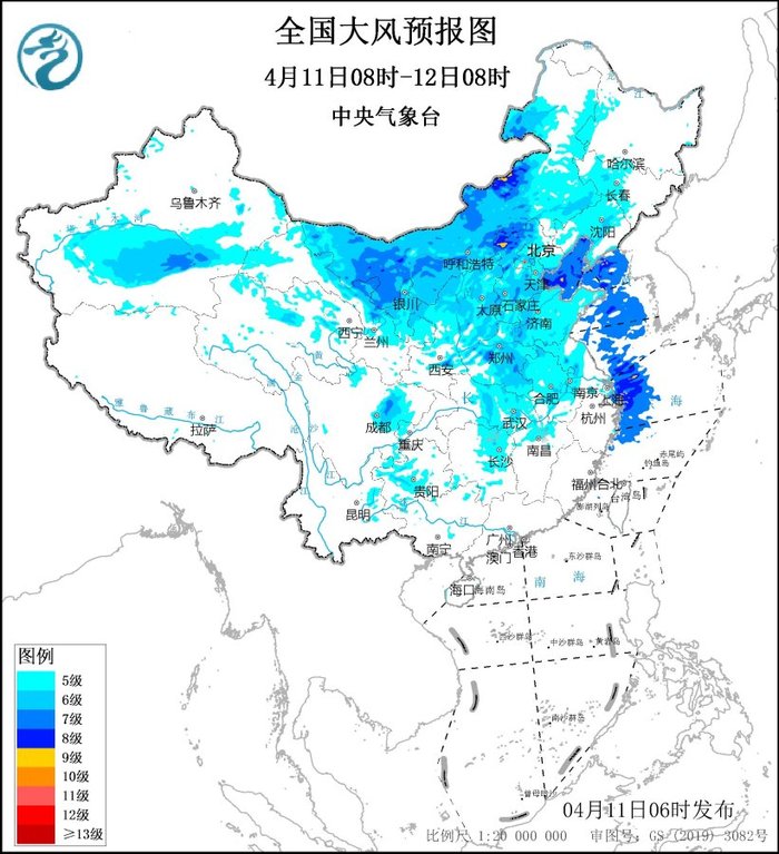 4月12日08时至13日08时,新疆东部、陕西北部、内蒙古中东部及东北地区中南部、华北、黄淮、江淮东部、江汉东部等地部分地区有6~8级大风,阵风9~10级,其中,内蒙古中东部、山西北部、河北北部、北京西部和北部山区等地局地阵风风力可达12~13级;渤海、渤海海峡、黄海大部海域、东海大部海域、台湾海峡、台湾以东洋面、南海北部海域、北部湾将有7~8级、阵风9~10级的大风,部分海域风力可达9~10级、阵风11~12级。