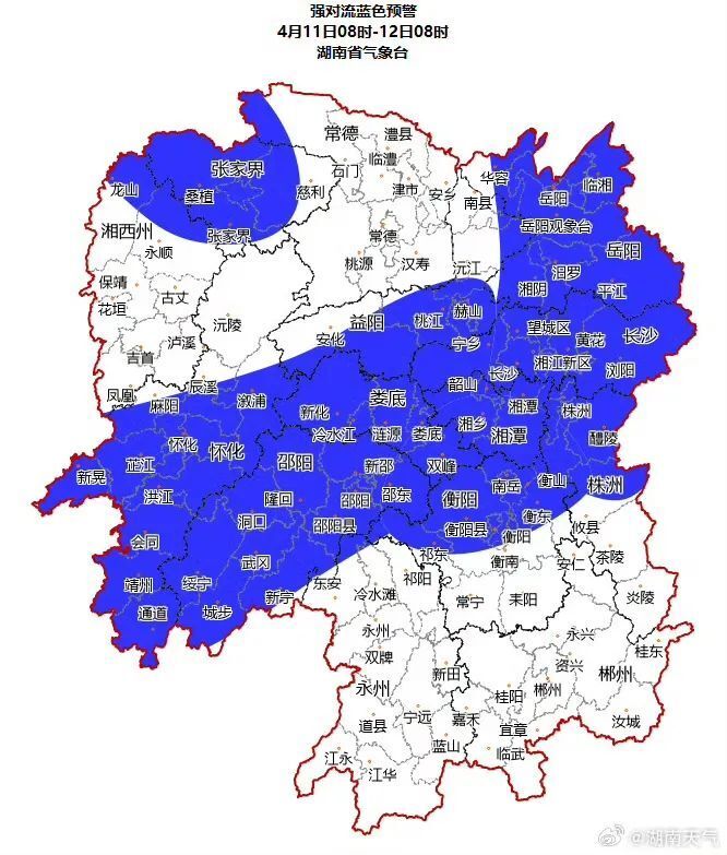 湖南省气象台4月11日6时发布暴雨蓝色预警:预计11日8时至12日8时,长沙、株洲、湘潭东南部、衡阳东北部、邵阳、岳阳、益阳东部、怀化南部将出现暴雨,并伴有短时强降水、雷雨大风、冰雹等强对流天气,请加强防范。