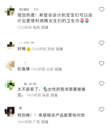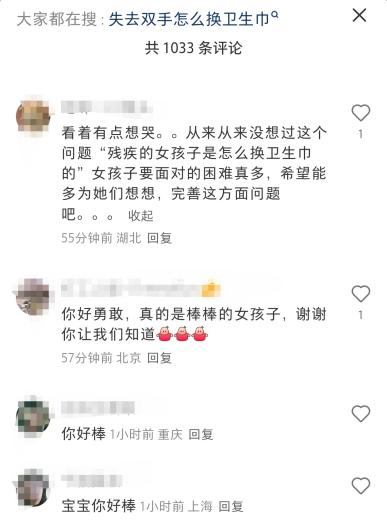 不少网友在评论区留言点赞,认为女孩“太勇敢了”。也有网友表示,“希望卫生巾至少设计得包装好拆一些,设计出更便利残障女生们的卫生巾”。