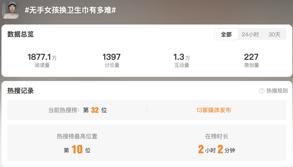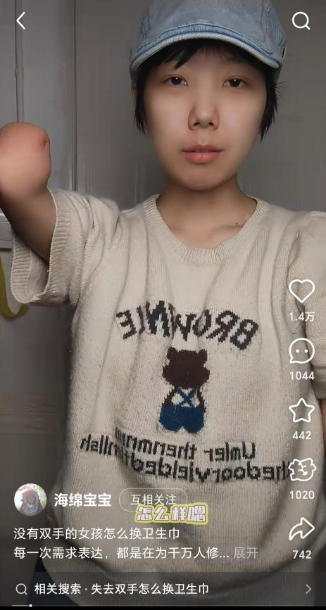 视频一经发出,迅速引发网友关注,话题#无手女孩换卫生巾有多难#登上热搜。