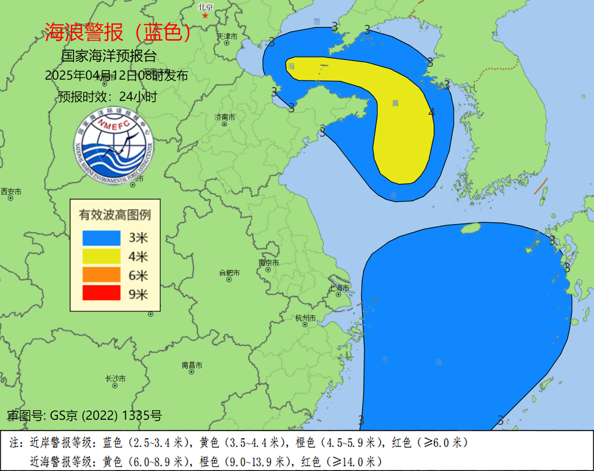 预计4月12日中午到13日中午,渤海、黄海、东海将出现2.5到4.5米的大浪到巨浪区;