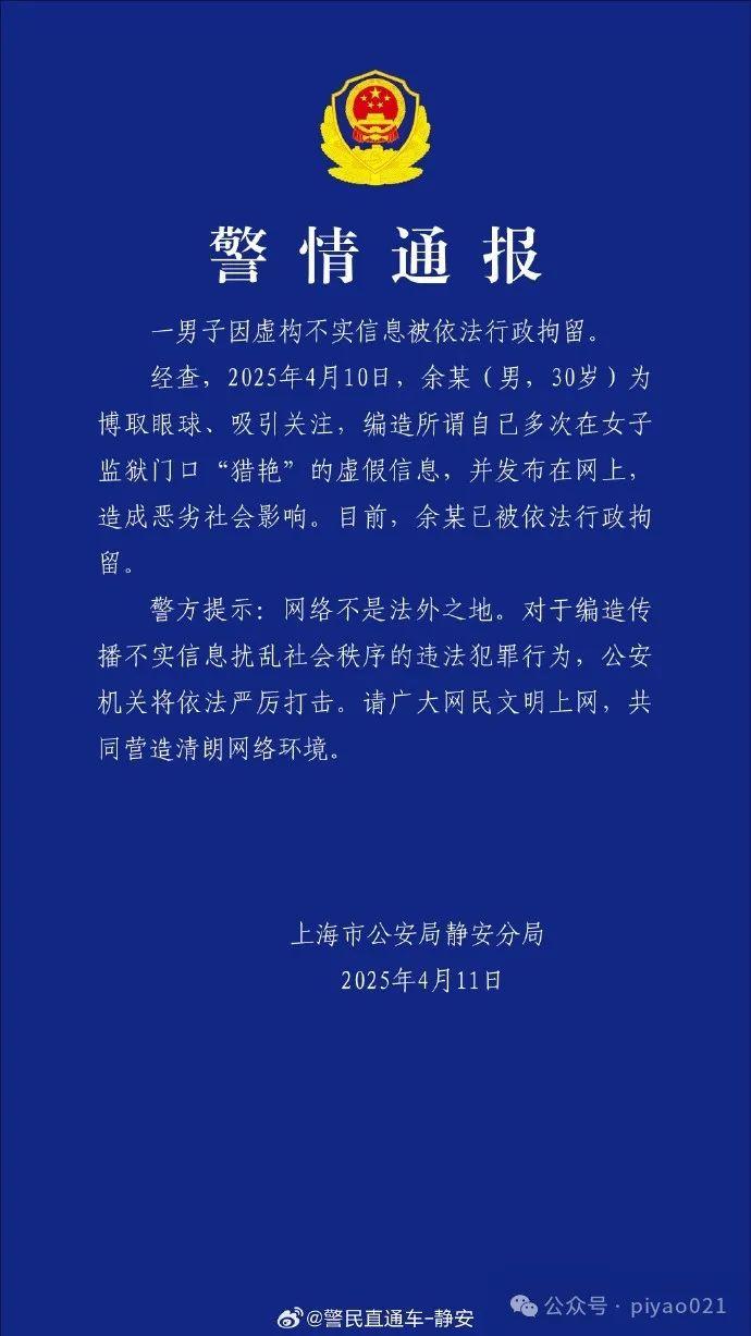经查,2025年4月10日,余某(男,30岁)为博取眼球、吸引关注,编造所谓自己多次在女子监狱门口“猎艳”的虚假信息,并发布在网上,造成恶劣社会影响。目前,余某已被依法行政拘留。
