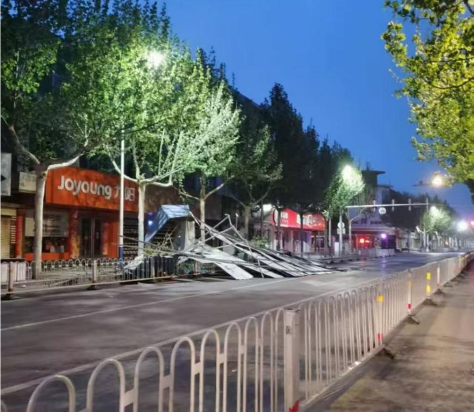 该住户提供了现场视频,称沁河路上有临街商铺房顶上的铁架子和电线都被大风吹落,有路边停放的车辆被砸。
