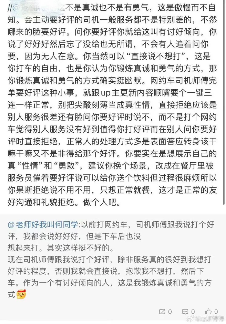 此外,还有人就其这一言论表示质疑,认为何同学作为互联网博主,希望大家给他的视频点赞、评论、关注,与网约车司机讨要好评性质相同。