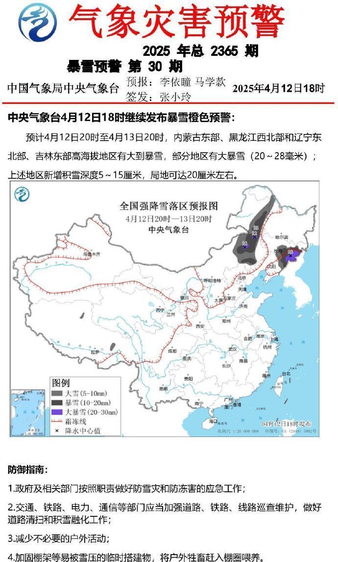中央气象台4月12日18时继续发布暴雪橙色预警