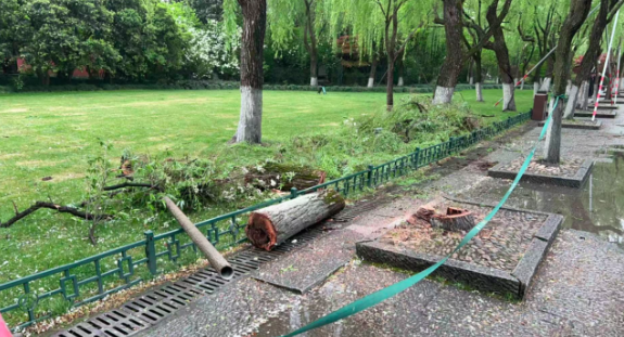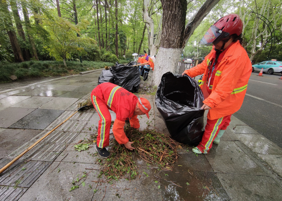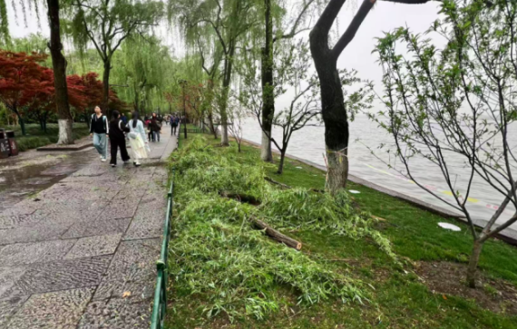 环卫师傅说,在这两小时里,他和专门负责绿化的工作人员一道,把西湖边吹落吹断的树枝树叶在最短时间内清理干净,让西湖游步道恢复正常通行。