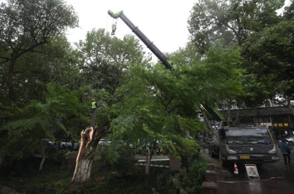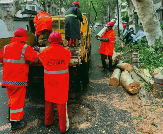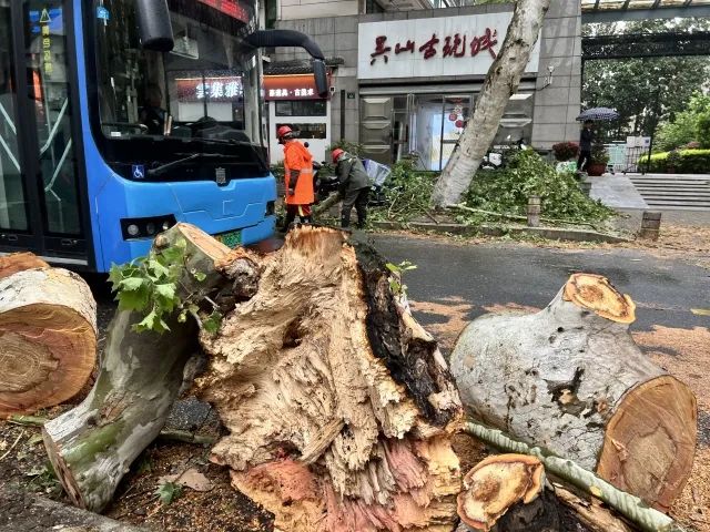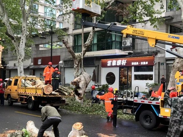 因为树干堵住,只有两车道的劳动路交通被迫中断。随后,在南山路作业的市政工作人员沈大姐和同事赶紧接到指令,过来支援清理。沈大姐说,因为这棵梧桐树特别粗,只能再让人先用电锯锯断,再叫来起重车,把树干运上货车。这个过程就足足花了三个小时。