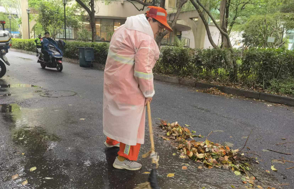 从早上到下午,她已经扫了整整六大桶树叶,比平常一天的量要多三倍。“正常4点半下班,今天大伙都要加班了。”
