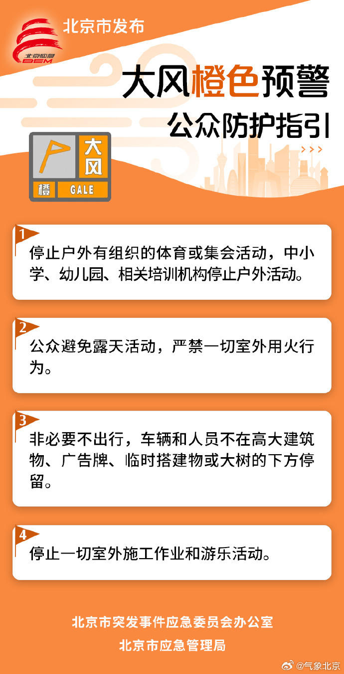 东城、西城、朝阳、大兴、顺义、平谷、密云等区有8~9级阵风,降级发布大风黄色预警信号。北京市仍然处于大风较强时段,严禁一切室外用火行为,大风橙色预警区域非必要不出行,大风黄色预警区域老、弱、病、幼减少户外活动,请做好防范。