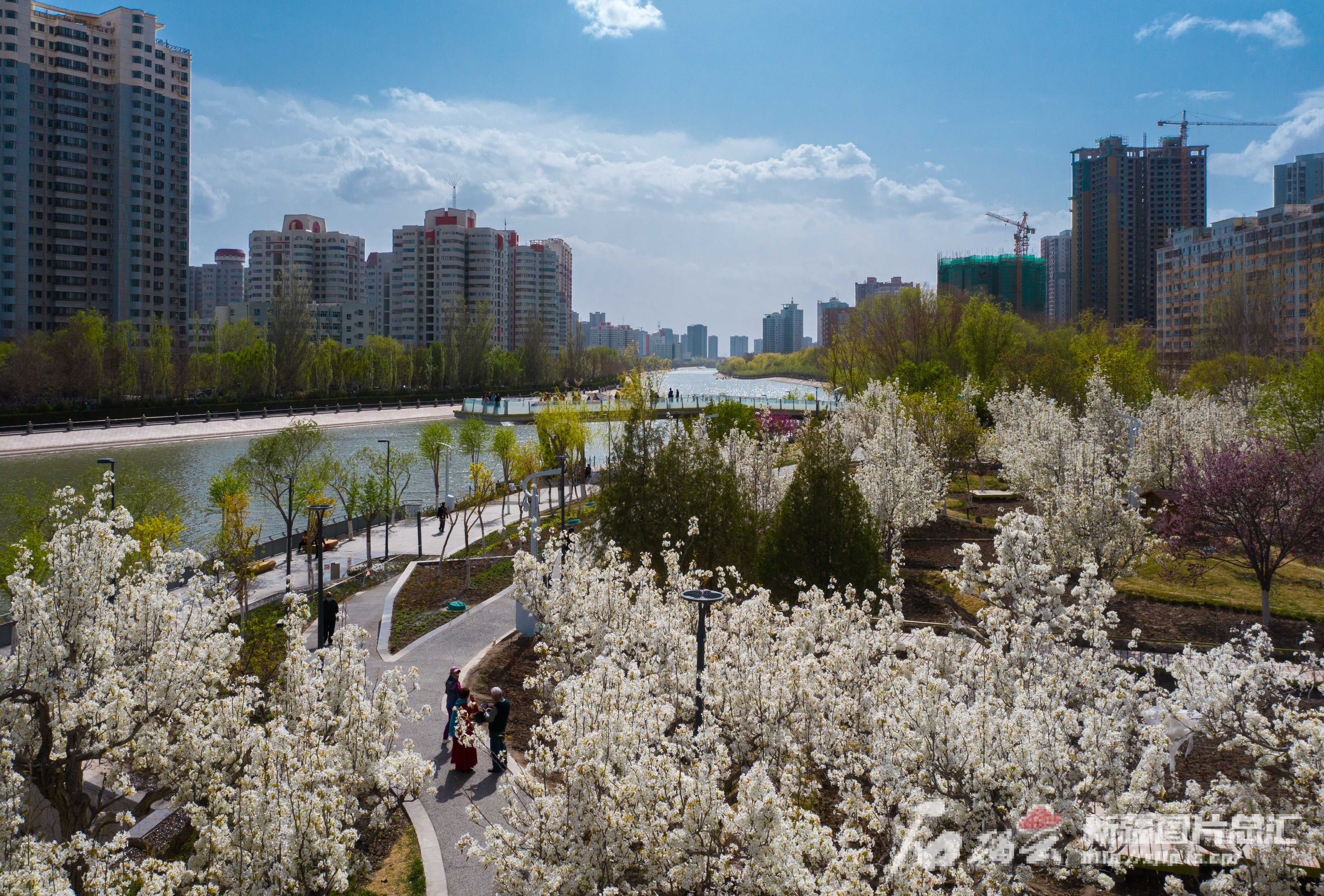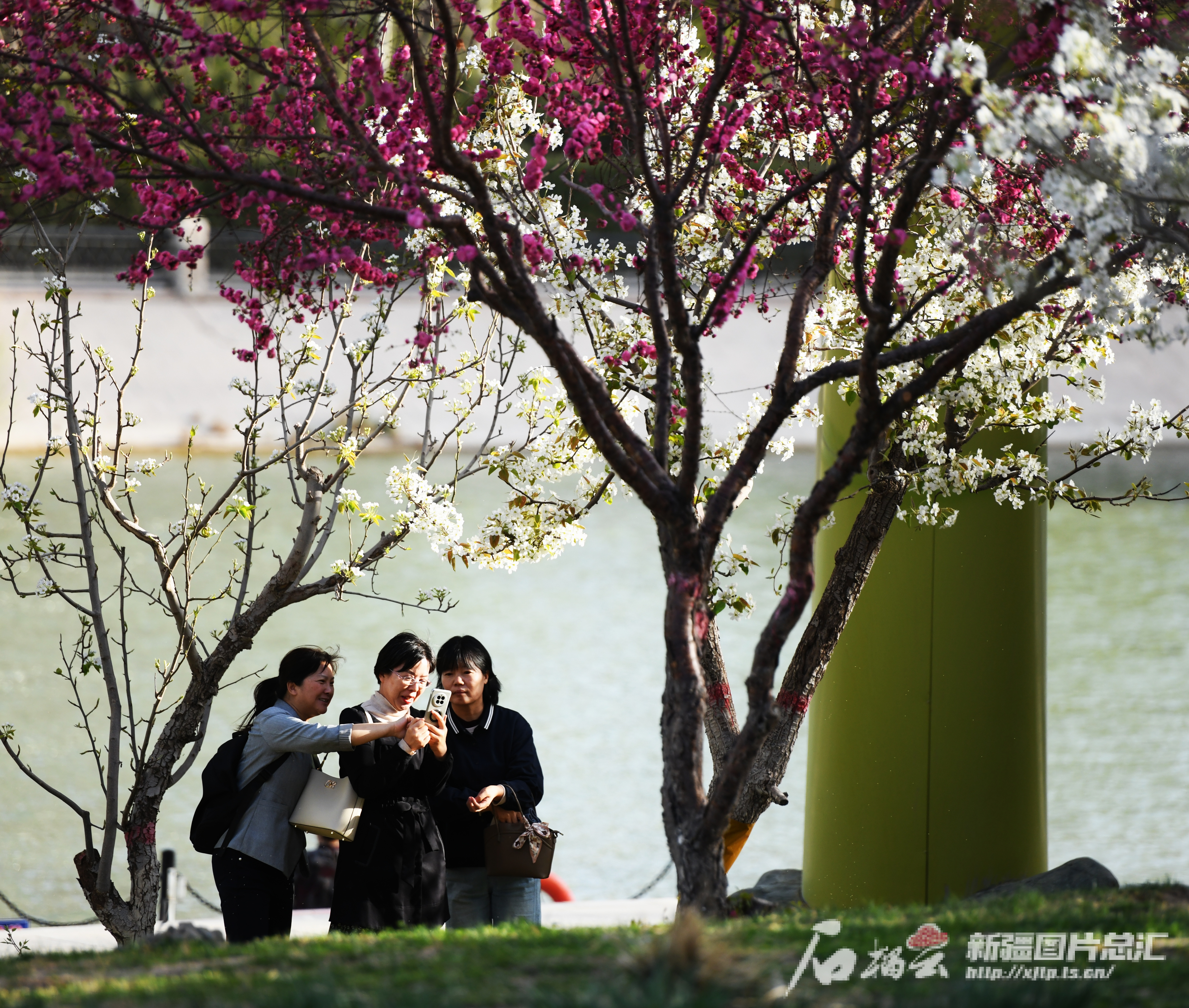 4月12日下午,游客在库尔勒市孔雀河边的梨香园观赏梨花。