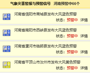 记者4月13日从河南气象了解到,今天白天,全省晴天间多云,偏西风5级左右,阵风8级左右,其中安阳西部、新乡西部、焦作、济源、三门峡、洛阳、郑州西部、平顶山西部、南阳北部局部10到12级,并伴有浮尘或扬沙。截至早上7点50分,河南66个大风预警信号生效中。