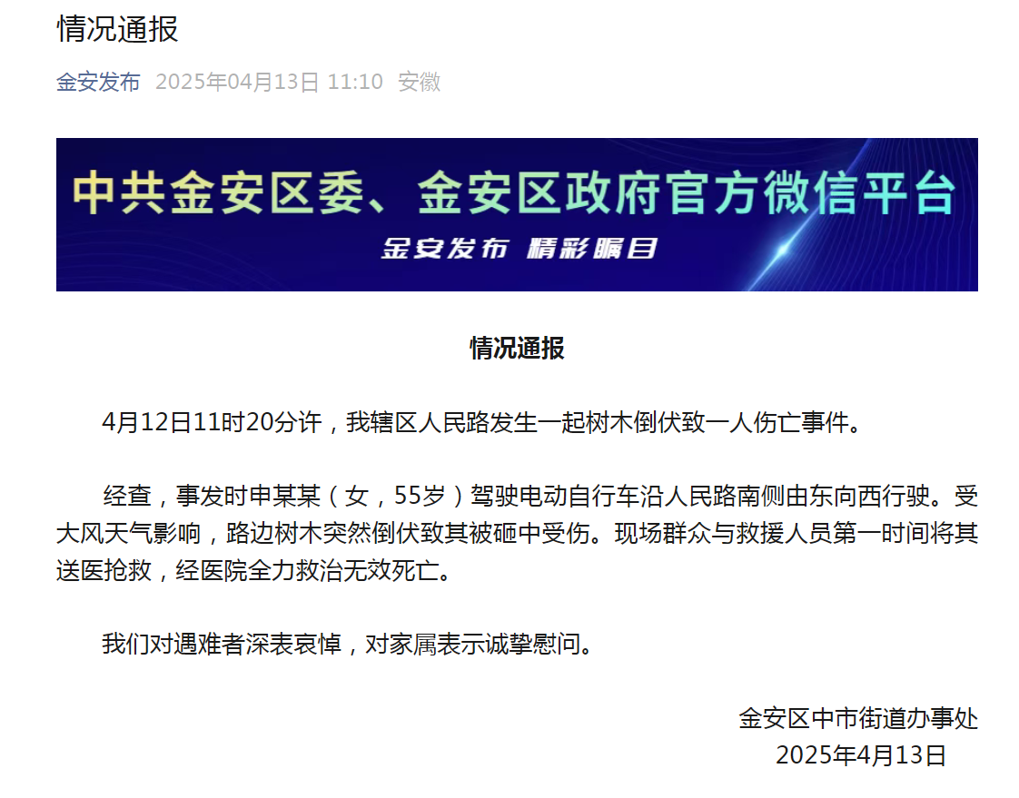 4月13日,“金安发布”微信公众号通报:4月12日11时20分,安徽六安市金安区中市街道人民路,55岁女子申某某骑电动车时,遇大风致路边树木倒伏被砸。经现场群众和救援人员送医抢救,申某某仍因伤势过重离世 。