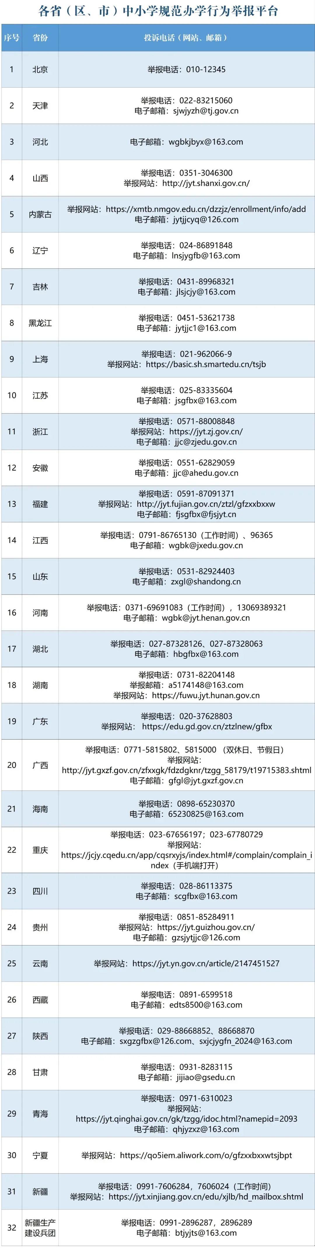 同时,教育部还统一公布了各省(区、市)教育行政部门中小学规范办学行为投诉举报电话和电子邮箱等,接受社会监督。