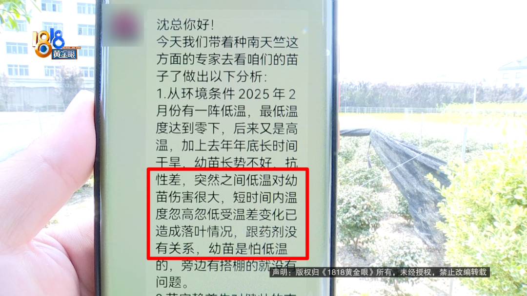 沈老板经营一家苗圃,说是2月份用了一款除草剂,两个星期之后,他发现苗木开始掉叶子了,估算损失有六七十万。