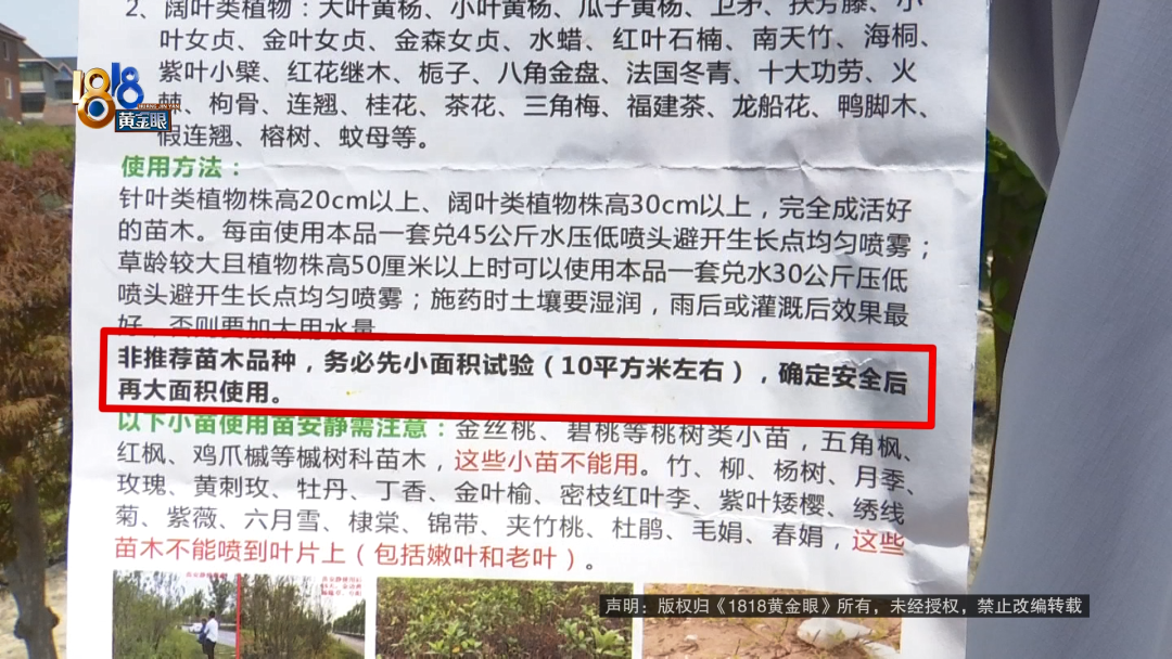 使用方法里有一段加粗的话“非推荐苗木品种,务必先小面积试验,确定安全后再大面积使用”。