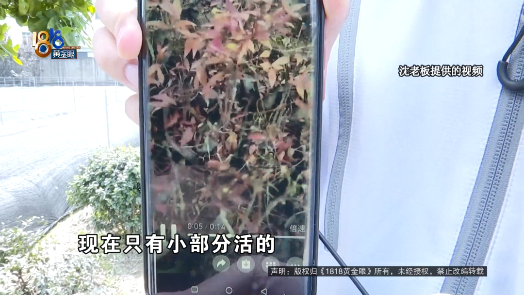沈老板:现在只有小部分活的,老叶子都没有了,变“次苗”了,有70%左右的苗死掉了。我现在损失大概是六七十万块钱,大杯苗有数量,小杯苗也有数量,我都点过了。