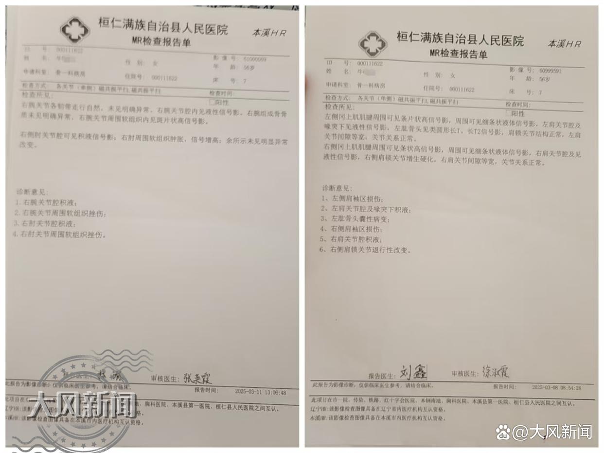 牛女士的诊断治疗单据显示,她被诊断为右肩关节腱袖损伤,并曾于2023年11月15日在中国医科大第一附属医院做了右肩关节镜下肩袖修补术,但之后一直活动受限右手麻木,近两年来先后检查出双侧正中神经SCV减慢、左侧肩袖区损伤、左肩关节腔及喙突下积液、左肱骨头囊性病变、右侧肩袖区损伤、右肩关节腔积液、右侧肩锁关节退行性改变等结果。
