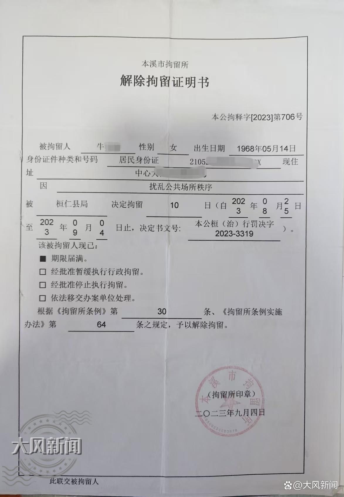 王女士说,警察没向当事人宣读就要求签了字,在没有告知的情况下将牛女士送到了拘留所,直到牛女士被释放收到《解除拘留证明书》后,才知道被拘留的时间是10天,家属之前也一直不知道处罚结果。
