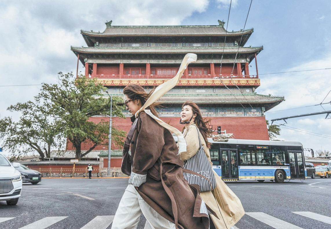 4月12日,游人在大风中从北京鼓楼前经过。李 昊摄