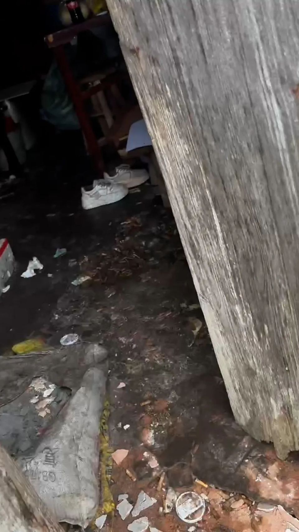 说是偏房,其实是个10平方米左右的农村土窑,破损的木门从外面被插栓锁住,推开时吱嘎作响,墙上的小窗被木板钉死,仅留了一条缝隙。屋内土墙发霉,开门时房梁还会往下掉渣。房间里堆满杂物,地面上腐烂的食物、烟头和排泄物混在一起,踩上去有些滑腻,散发着酸臭味。角落里的木板床上没有任何铺盖。