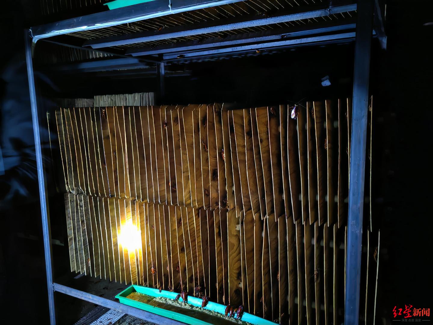 在养殖车间的走廊,借着手机手电筒射出的光,红星新闻记者看到了“成年”美洲大蠊居住的房子——“芯片”。“芯片”形似一个立体养殖箱,这些“芯片”都是为美洲大蠊而定制的,宽度和厚度都有标注。用手电筒的光一扫,美洲大蠊仓皇而逃,发出一阵阵“沙沙”声。