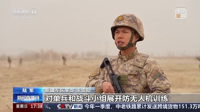新疆军区某部张崇阳:我们针对无人机作战需求,对单兵和战斗小组展开防无人机训练,研究探索战场环境“闪躲防”、现地工事“加装防”、新域手段“科技防”三种方法,提升无人机反制打击能力。