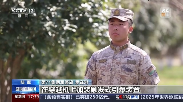 第71集团军某旅景在琳:我们充分借鉴现代战争中无人机作战样式,在穿越机上加装触发式引爆装置,做了大量实验,最终实现飞机接触敌人的瞬间引爆雷管,达到精准杀伤的效果。