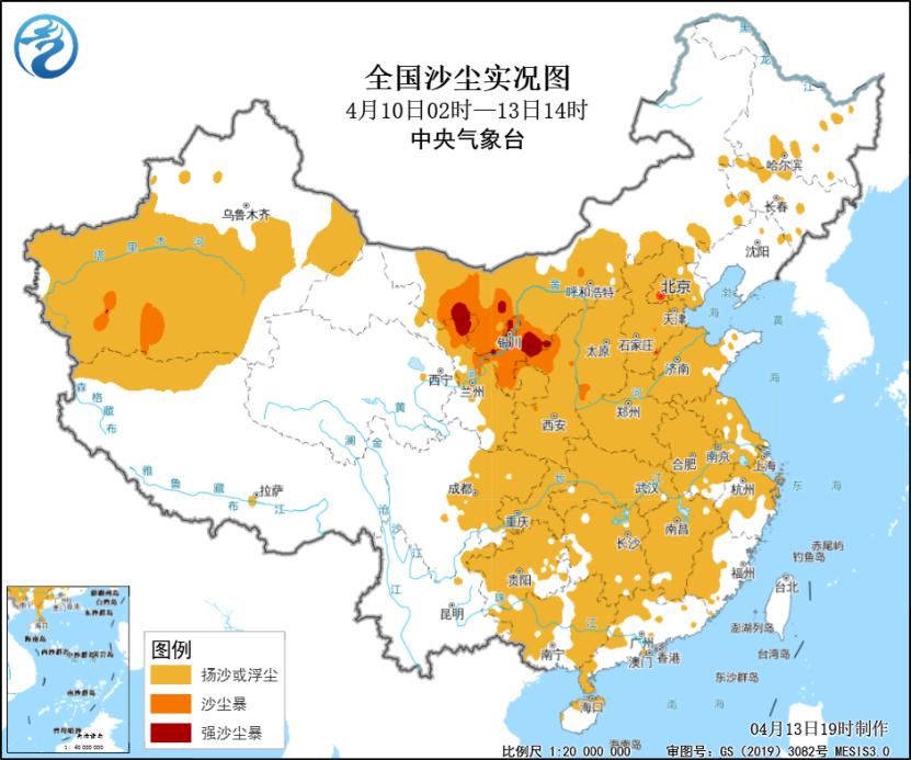 受大风和传输影响,10日至13日中东部大部地区出现沙尘天气,最远传输到海南岛北部,影响面积超过430万平方公里,其中,内蒙古西部、宁夏、甘肃中部以及陕西延安、榆林和宝鸡、山西运城、河北衡水和邢台等地局地出现沙尘暴或强沙尘暴。