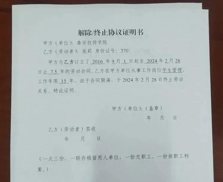 然而,4月13日,张莉却发文陈述称,泰安技师学院人事处3月1日打电话通知合同到期,“到期不再续签,让我尽快去人事处在解除/终止协议证明书和补偿协议书上签字。”且学院3月1日开始就单方面强制停止了她的工作,停发工资并终止缴纳各项保险。