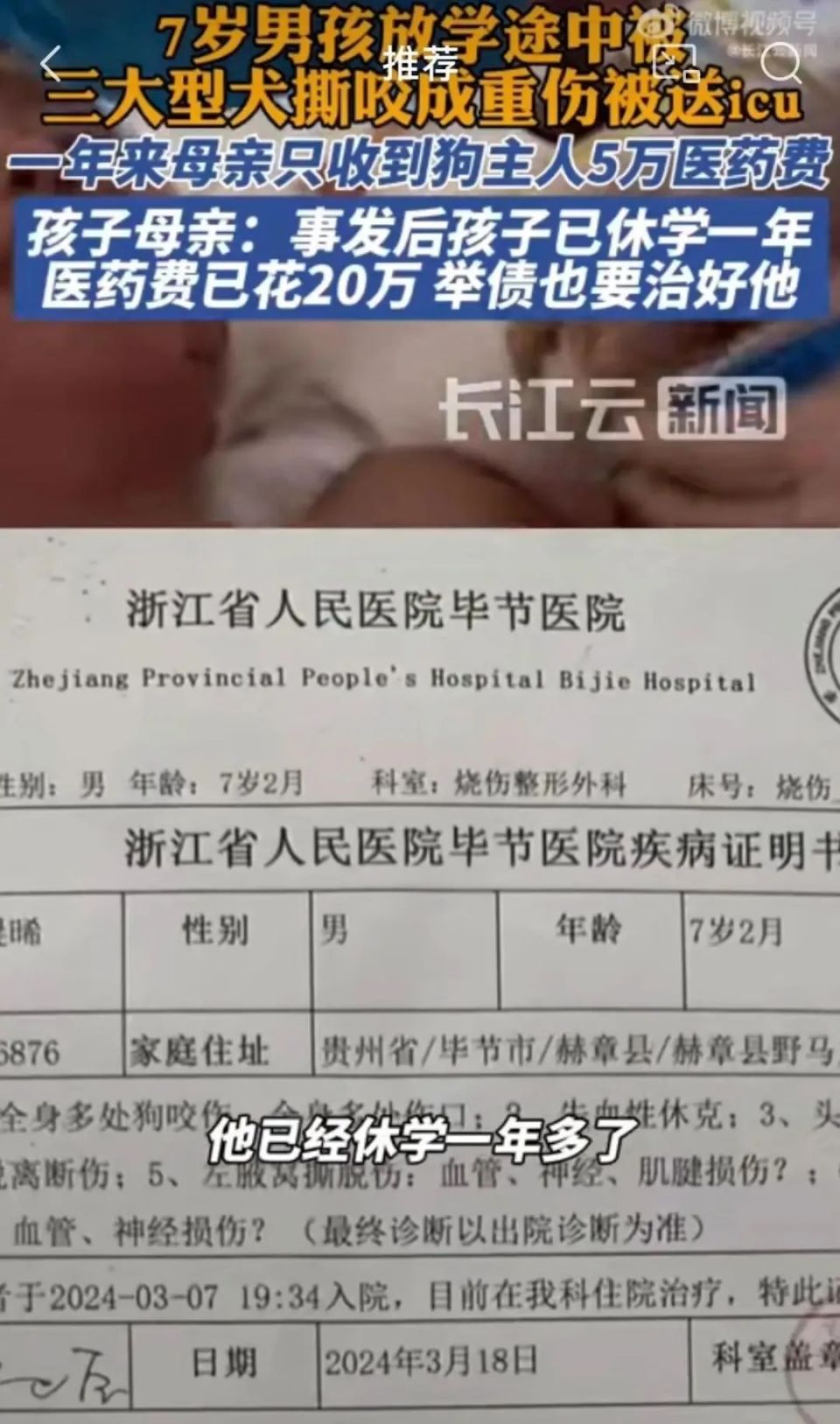贵州毕节赫章县一男孩,在2024年3月份放学途中被三条大型犬咬重伤,头皮撕裂,左耳被撕咬下来,手和脚腋窝也被咬伤。