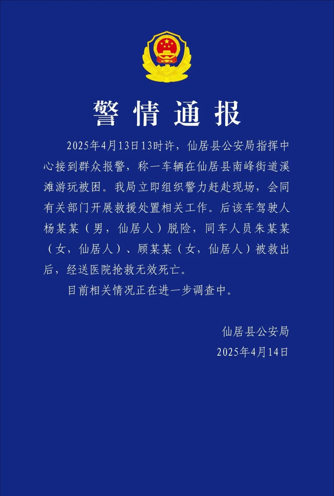 4月13日13时,仙居县公安局接群众报警,称有车辆于南峰街道溪滩游玩被困。仙居县公安局接警后迅速救援,驾驶人杨某某脱险,同车朱某某、顾某某送医抢救无效死亡,警方正深入调查。