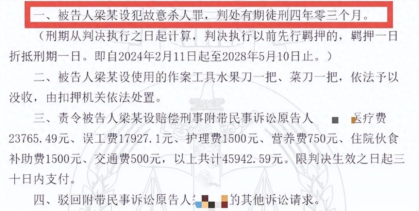 综上,判决被告人梁某设犯故意杀人罪,判处有期徒刑四年零三个月。责令被告人梁某设赔偿刑事附带民事诉讼原告人郑某某共计45942.59元。