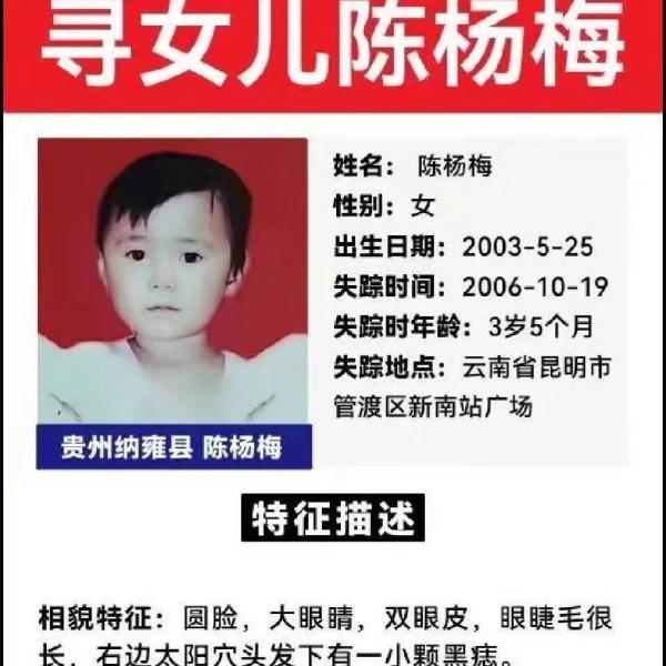 从寻女启事上可以看到,陈杨梅,出生日期:2003年5月25日;失踪时间:2006年10月19日;失踪地点:云南省昆明市官渡区新南站广场。特征:圆脸、大眼睛、双眼皮、眼睫毛很长,右边太阳穴头发下有一颗小黑痣。