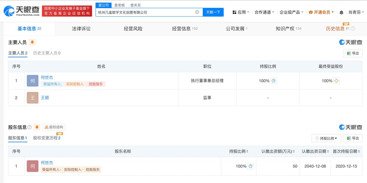 记者通过天眼查查询到,何世杰(何同学)名下关联1家杭州几盒数字文化创意有限公司,该公司成立于2020年12月,注册资本50万人民币,经营范围包括广播电视节目制作经营、电子出版物制作、音像制品制作、演出经纪、网络文化经营、个人互联网直播服务等,何世杰在该公司担任法定代表人、执行董事兼总经理并全资持股。