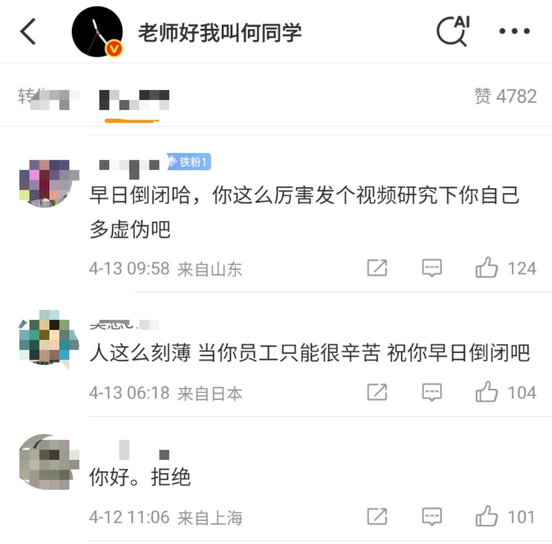 何同学目前其已删除涉事微博,暂未做出公开回应。记者在其最新的一条招聘员工的微博下看到,不少网友留下“刻薄”“希望善待弱势群体”等评论。