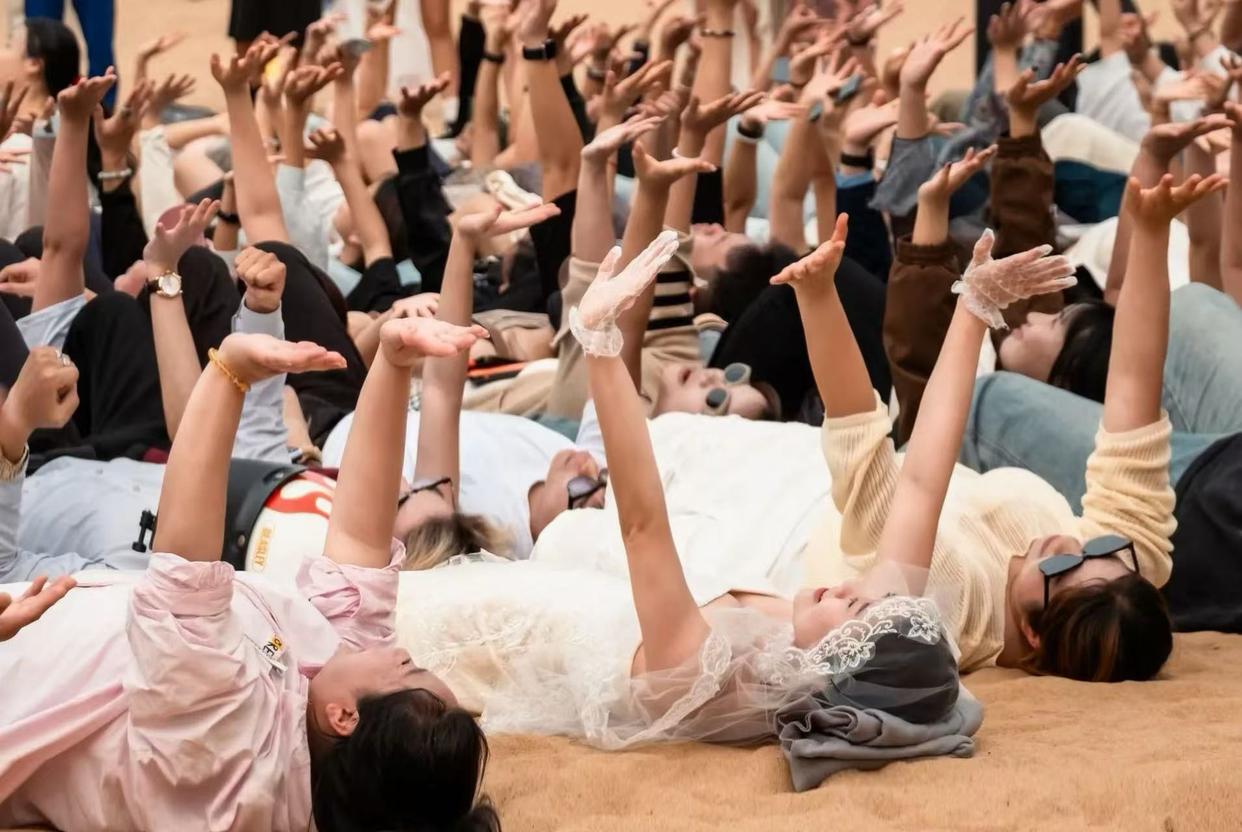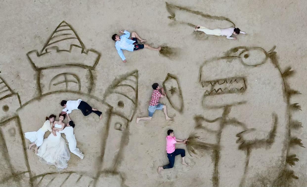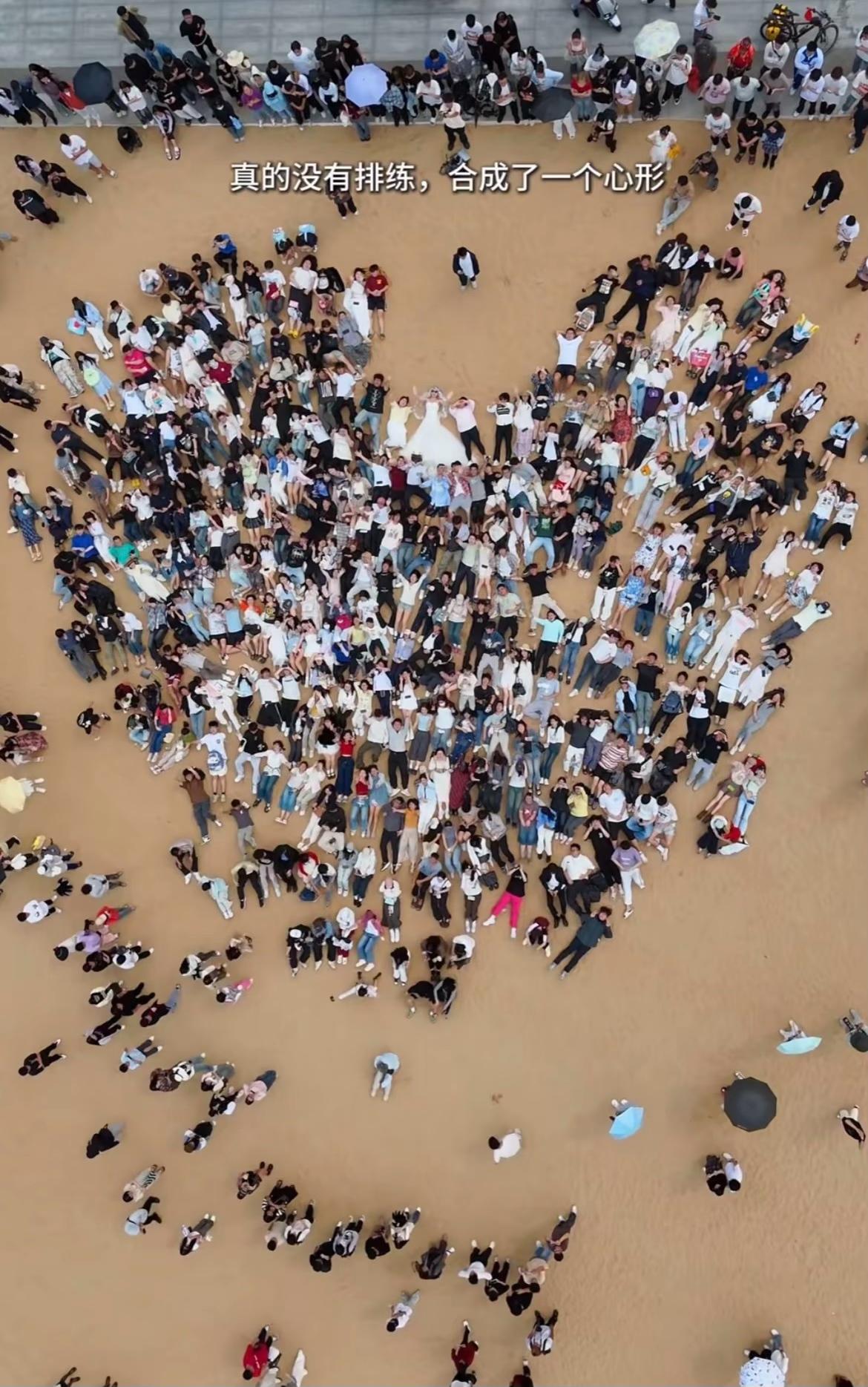 4月14日,潇湘晨报记者与黄女士取得联系。“路人冲过来躺在地上,那一瞬间形成了一个大大的爱心”,黄女士介绍,当时在摄影师的奇思构想下,决定发动当时周边游玩的游客来帮忙加入一起躺着来完成这组特殊的“站立”的婚纱照。“没有彩排,就是两点,摄影师说我们一起躺下,和我一起躺下,拍出一个站立的感觉,大家那一瞬间一拥而上,真的震撼到我了,拍出来一次彩排都没有过”。后期成片的“站立”婚纱照一个由游客躺在沙滩上形成的爱心形状,黄女士强调说她们没有任何的提前彩排,对这样的成片也非常意外和开心。