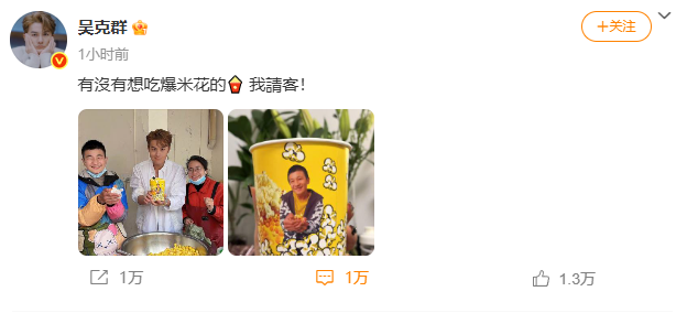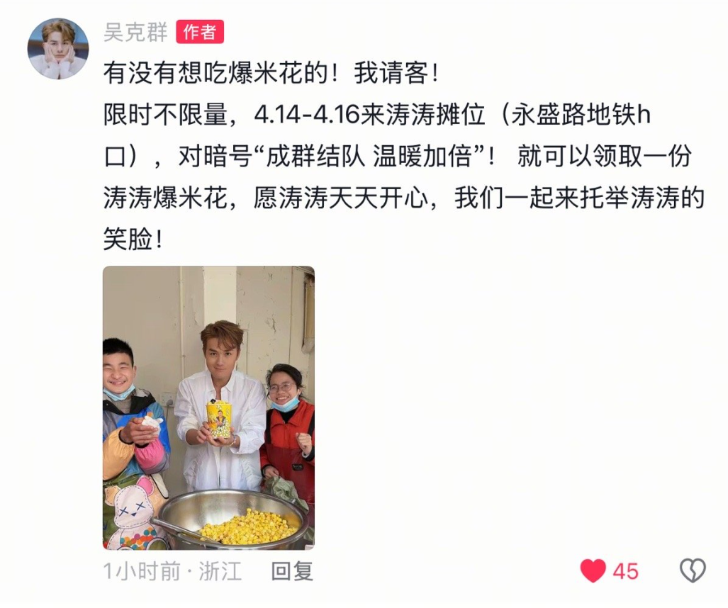 4月14日,歌手吴克群在多个社交平台发文:有没有想吃爆米花的,我请客,并附上了和涛涛一起手捧爆米花的合照。