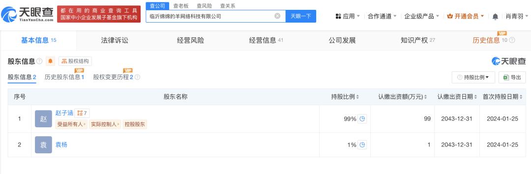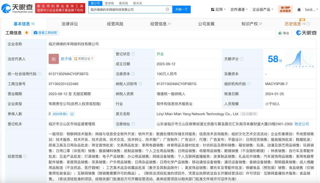 天眼查App显示,临沂绵绵的羊网络科技有限公司成立于2023年9月,法定代表人为赵子涵,注册资本100万人民币,经营范围包括纸制品销售、个人卫生用品销售、日用品销售、母婴用品销售等,由赵子涵、袁杨分别持股99%、1%。年报信息显示,2024年该公司参保人数为2人。