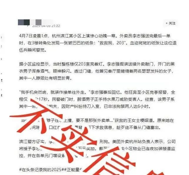 经核查,文中所述“4月7日凌晨滨江区发生恶性案件”等内容纯属虚构。