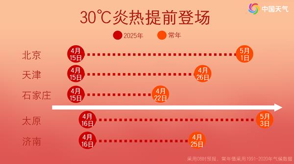 大城市中,北京、天津、石家庄、济南、太原都将是今年首次达到30℃以上,郑州、石家庄明天冲击35℃高温线,争夺今年北方省会级城市首个高温,并可能打破北方省会、直辖市、首府最早高温日纪录;西安明天最高气温可达34℃,后天会达到35℃,也可能出现高温。