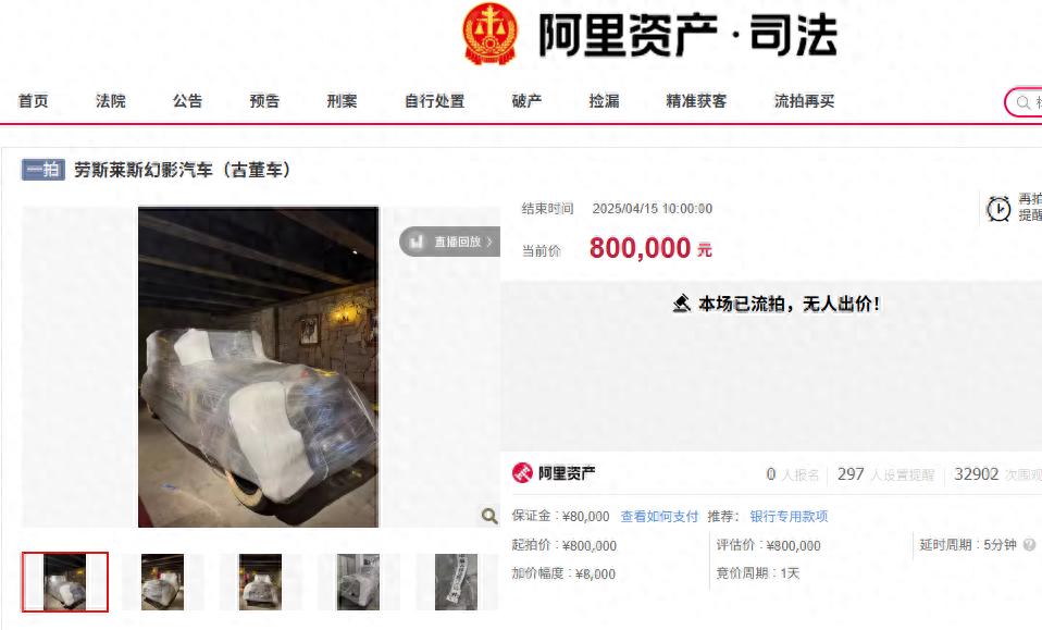 红星资本局4月15日消息,据阿里司法拍卖平台,一辆起拍价80万元的劳斯莱斯幻影古董车,今日流拍。